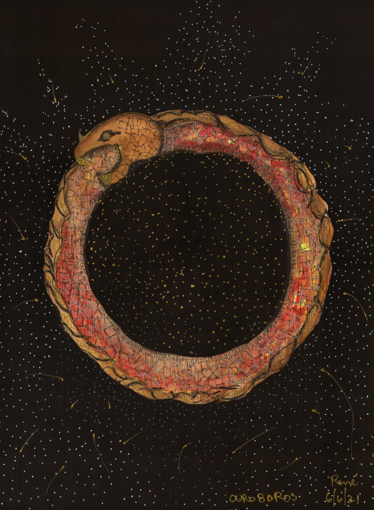 “The ouroboros or uroboros is an ancient symbol depicting a serpent or dragon eating its own tail. Originating in ancient Egyptian iconography, the ouroboros entered Western tradition via Greek magical tradition and was adopted as a symbol in Gnosticism and Hermeticism and most notably in alchemy. The term derives from Ancient Greek from ‘oura’ – ‘tail’ plus ‘boros’ -‘eating’. The ouroboros is often interpreted as a symbol for eternal cyclic renewal or a cycle of life, death, and rebirth.”